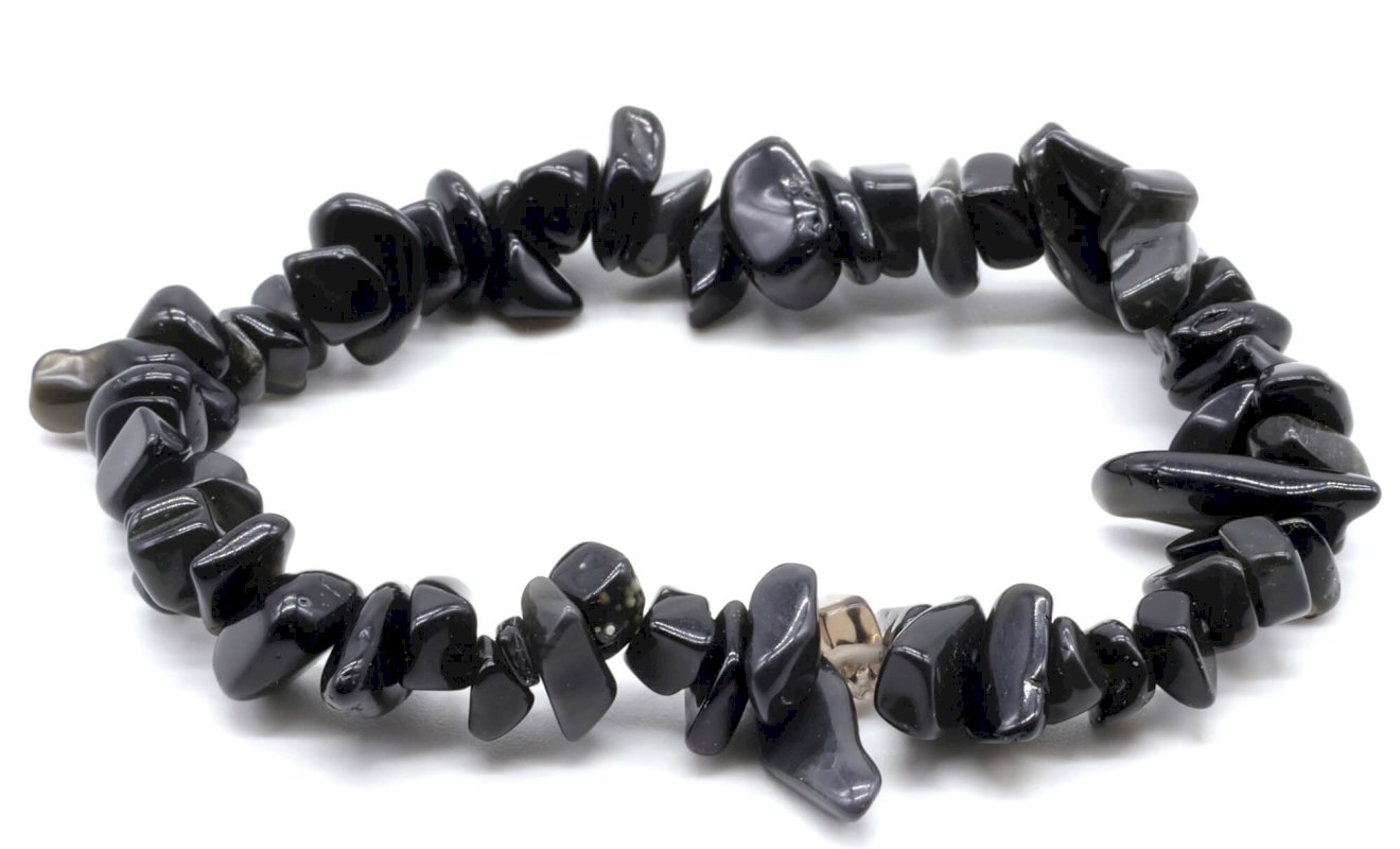 AccediBracciale elastico in pezzi di pietre di ossidiana nera. Dimensioni universali.