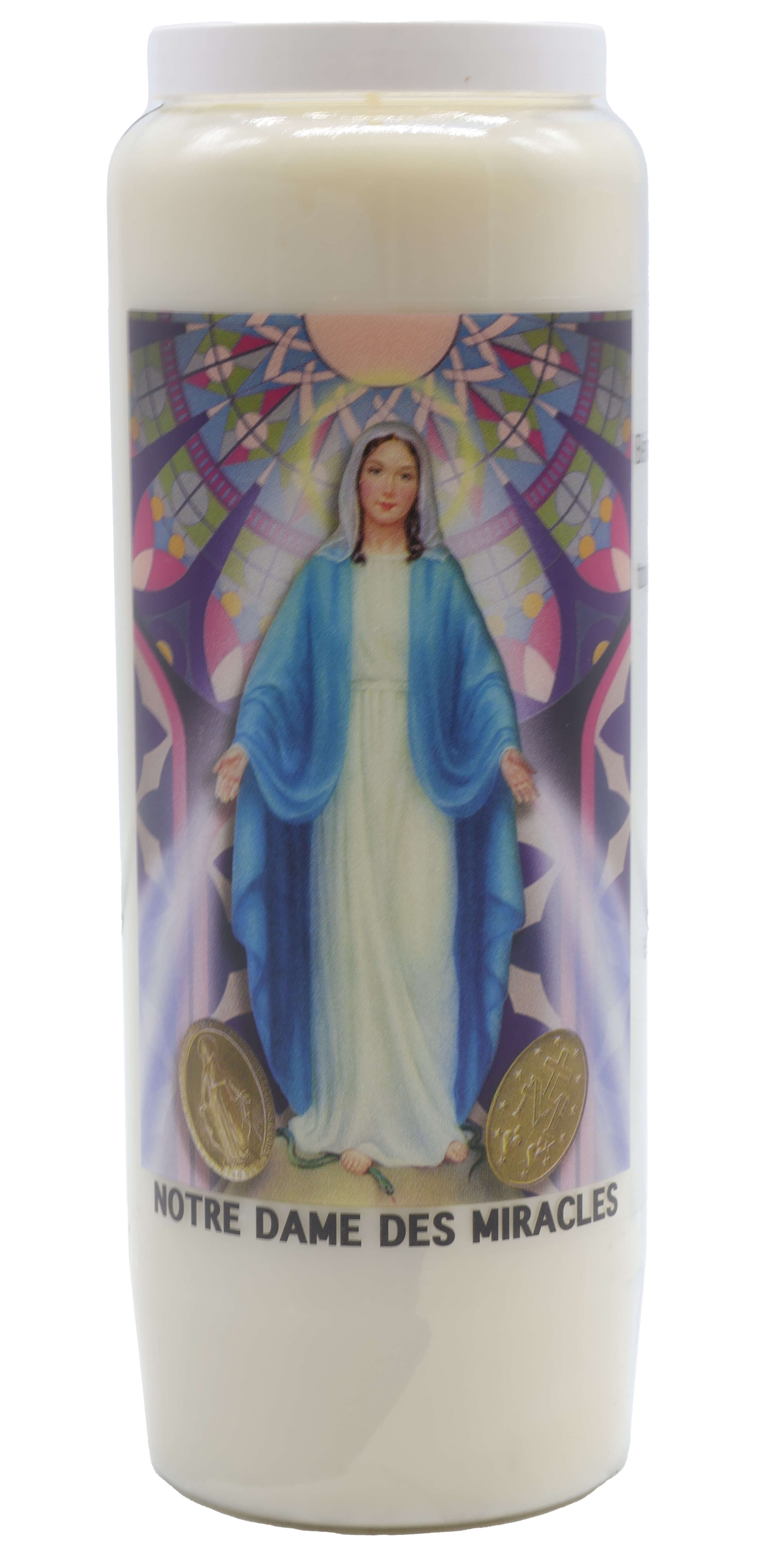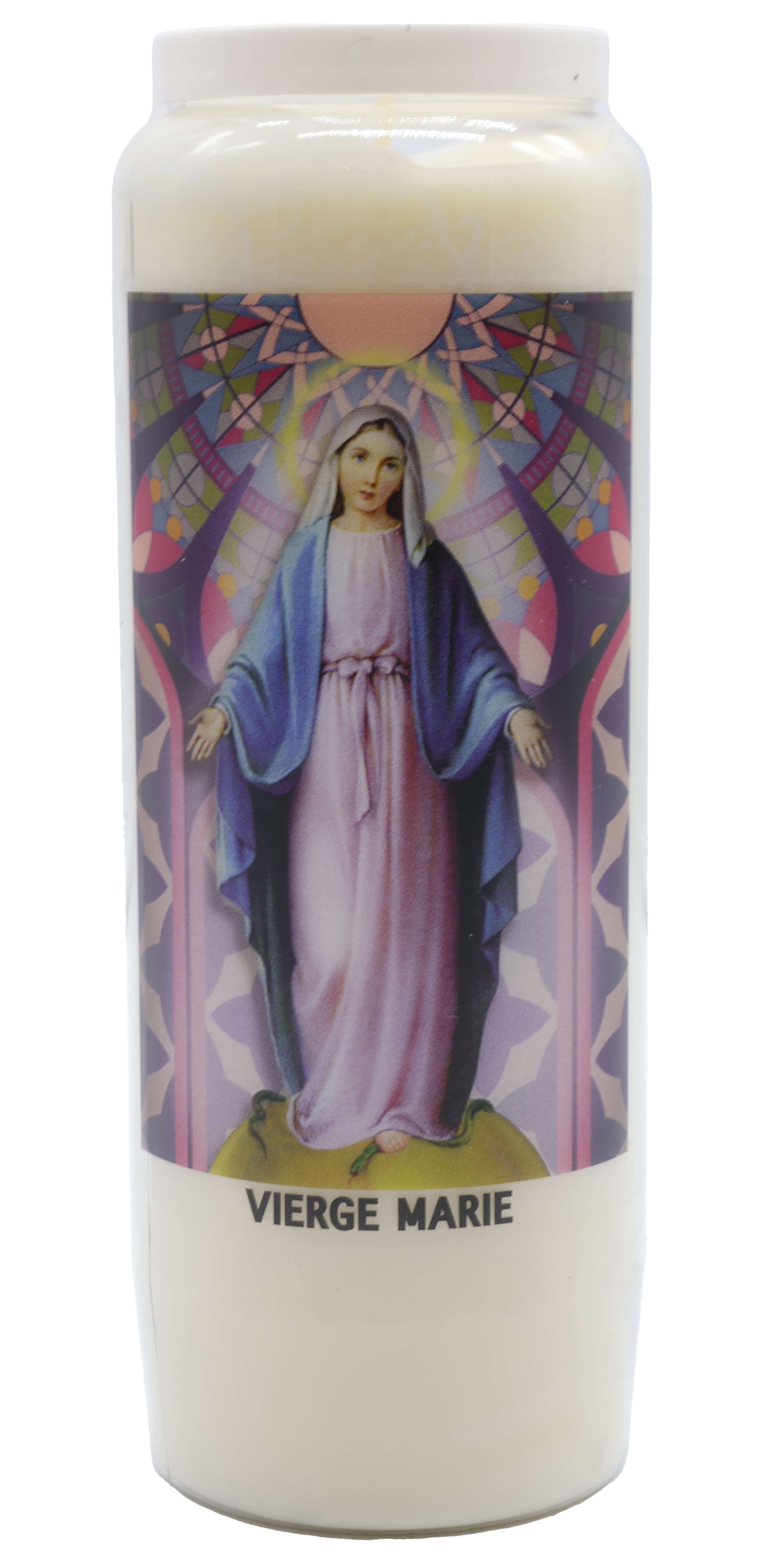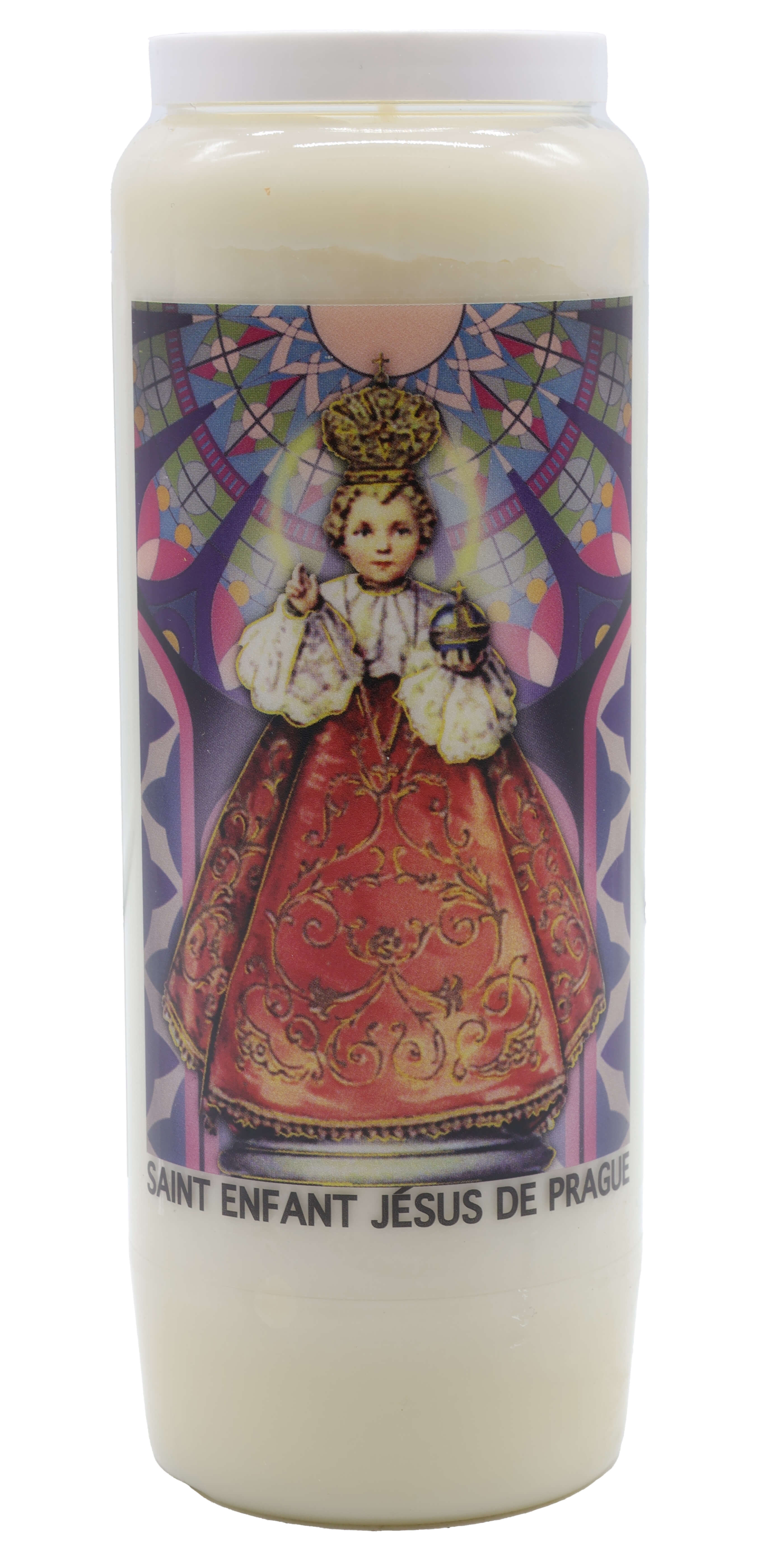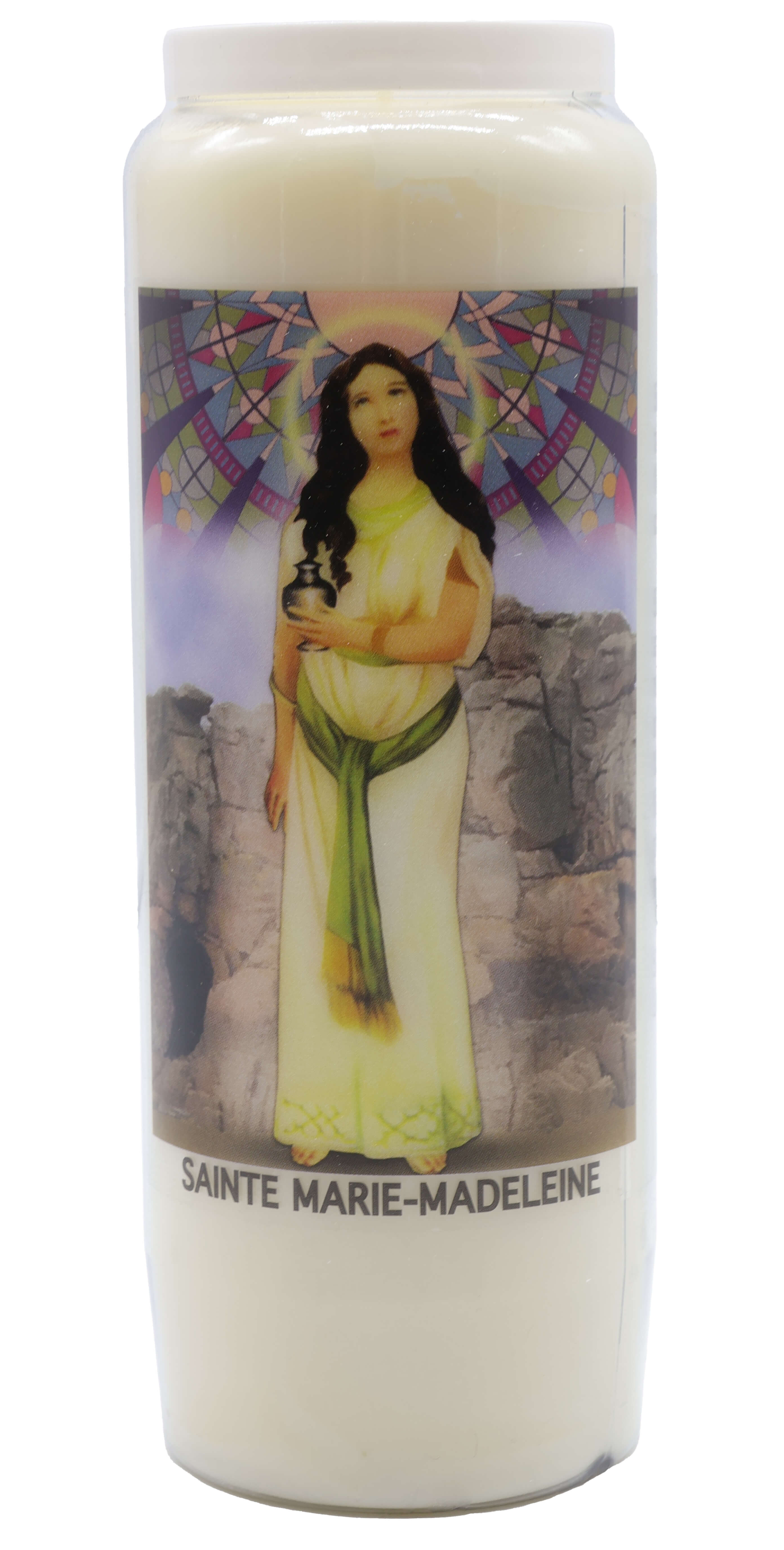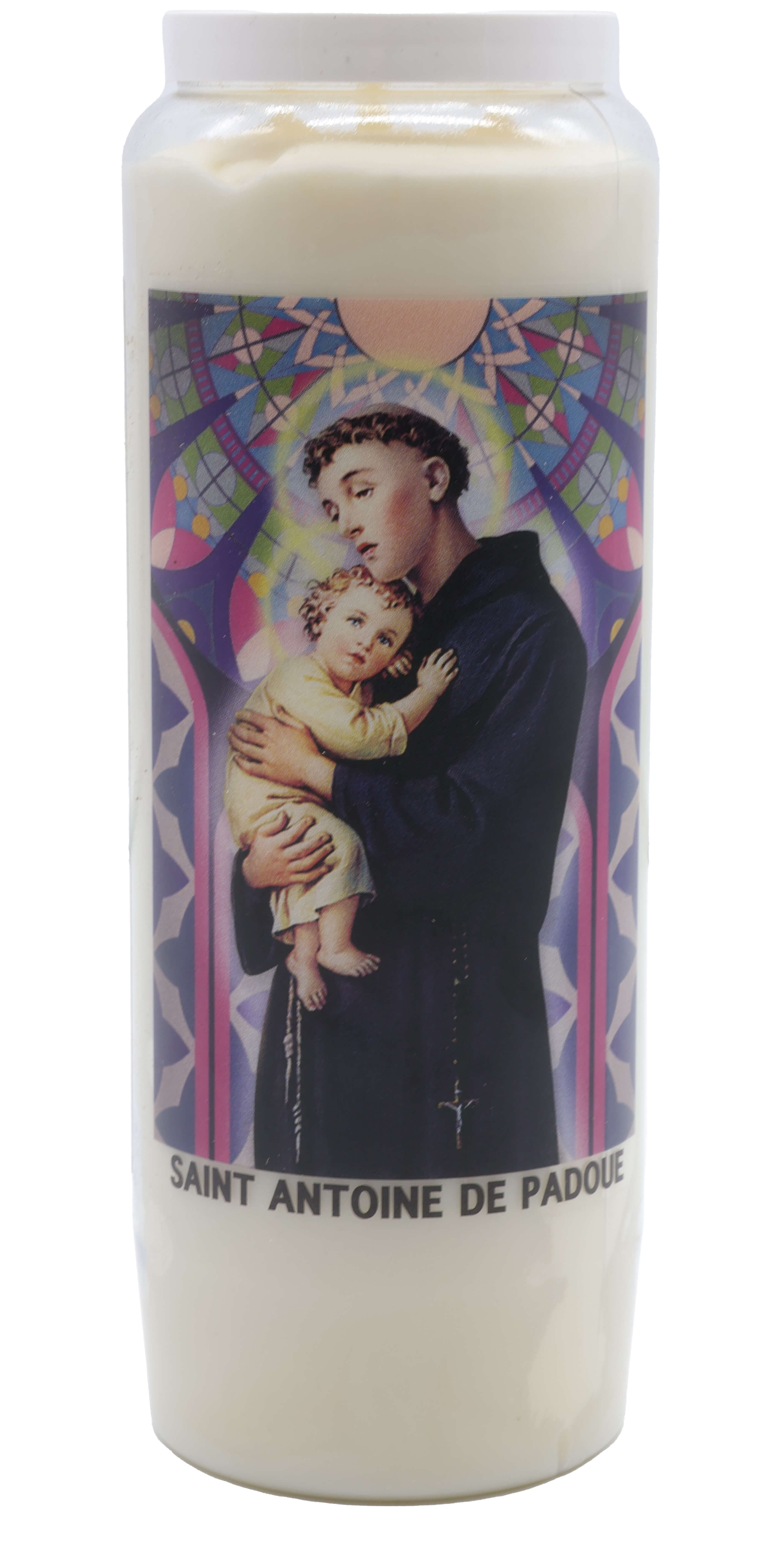 Vendita all'ingrosso di Novene di cera vegetale religiose . Le novene si bruciano per circa 9 giorni. Venduto etichettato in francese con una preghiera sul retro.