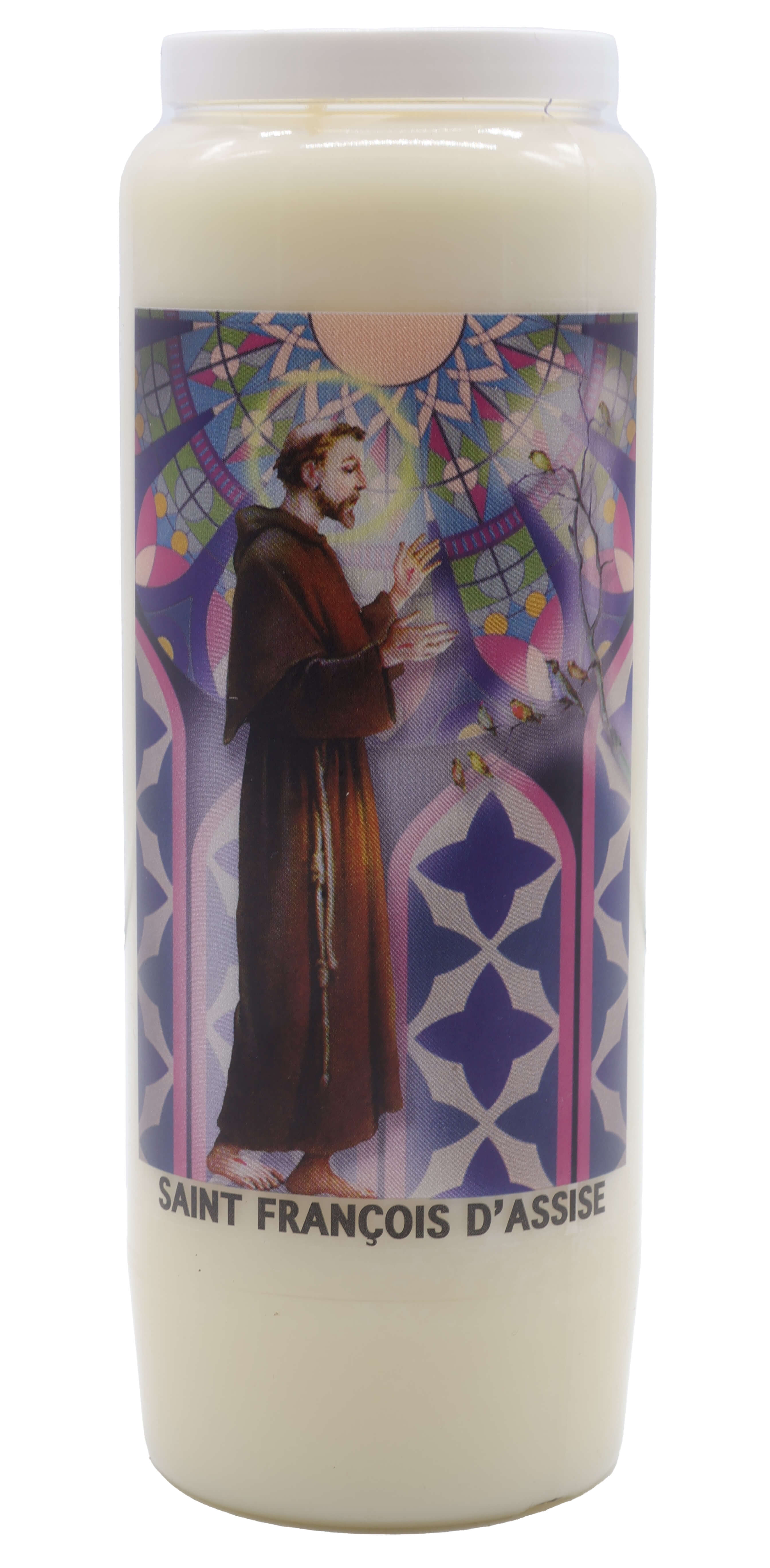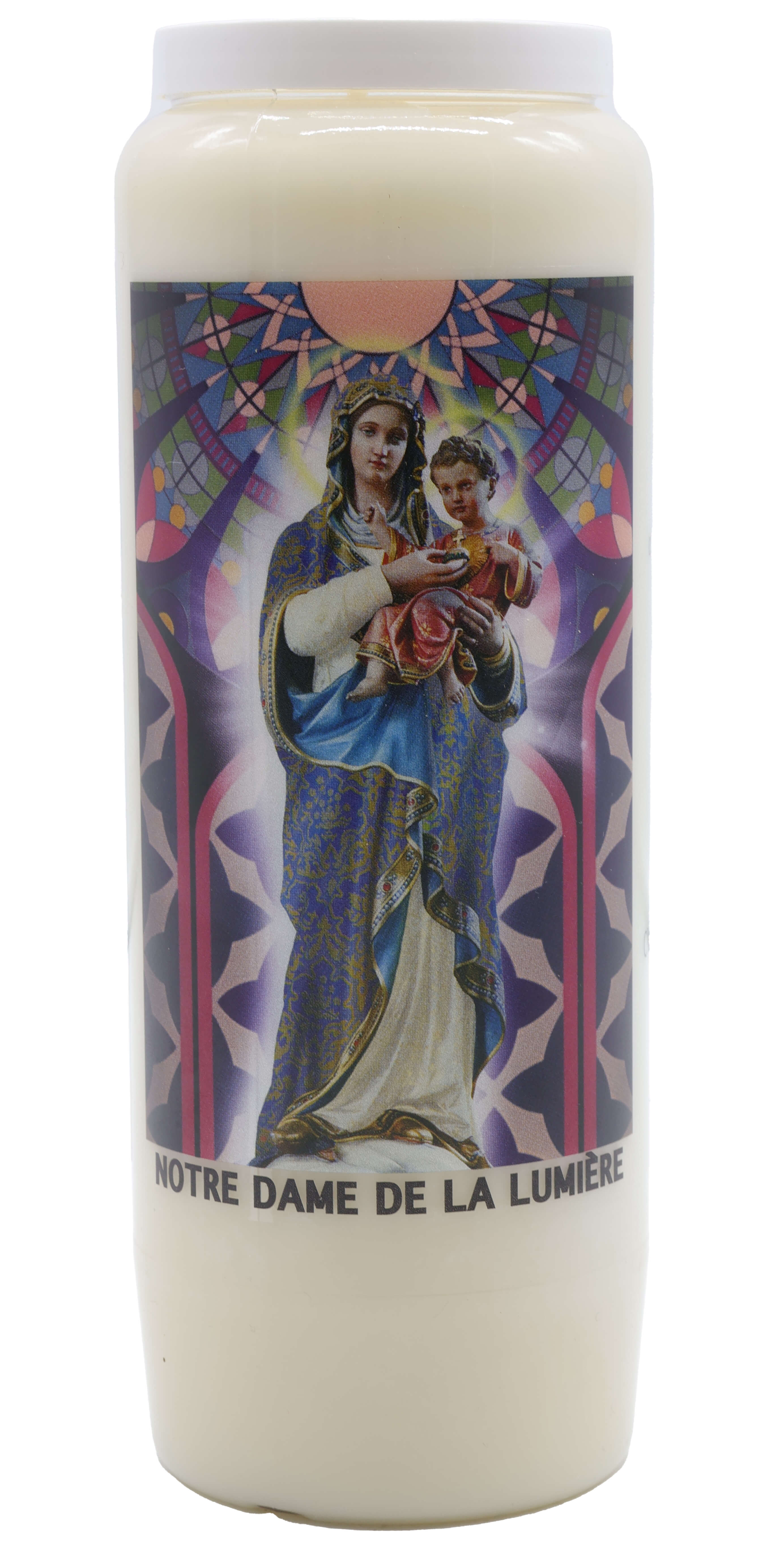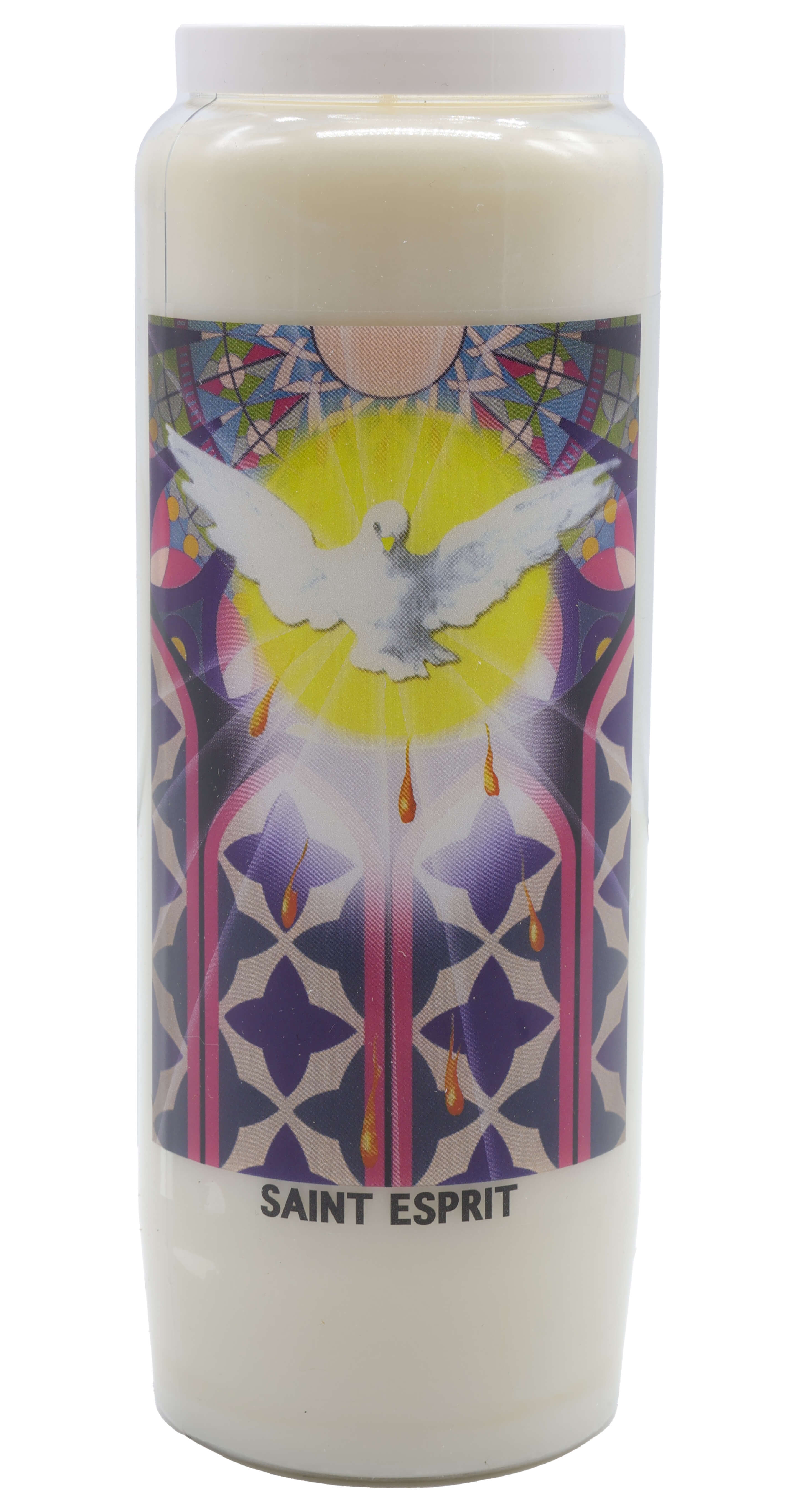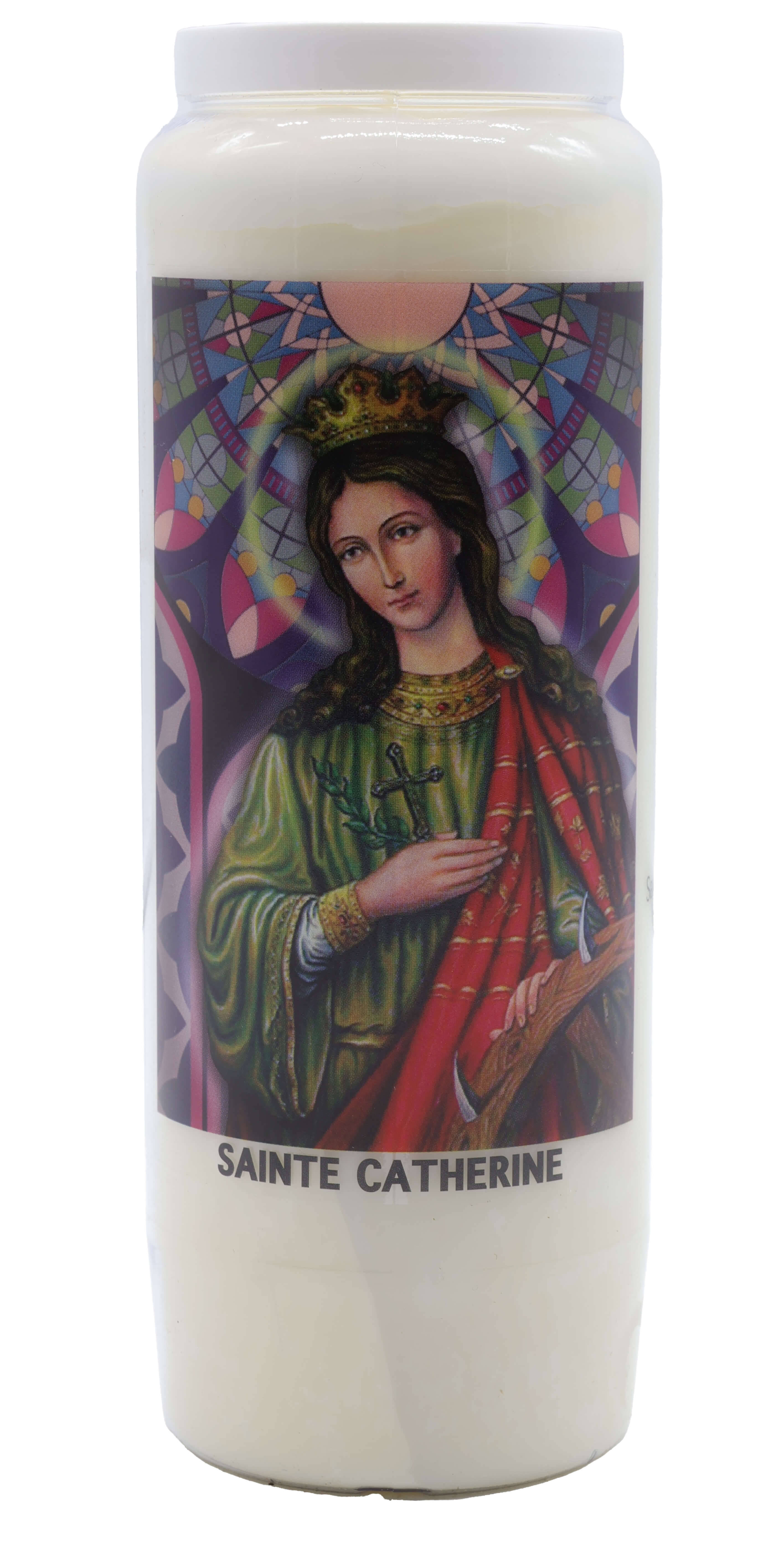 Vendita all'ingrosso di Novene di cera vegetale religiose . Le novene si bruciano per circa 9 giorni. Venduto etichettato in francese con una preghiera sul retro.