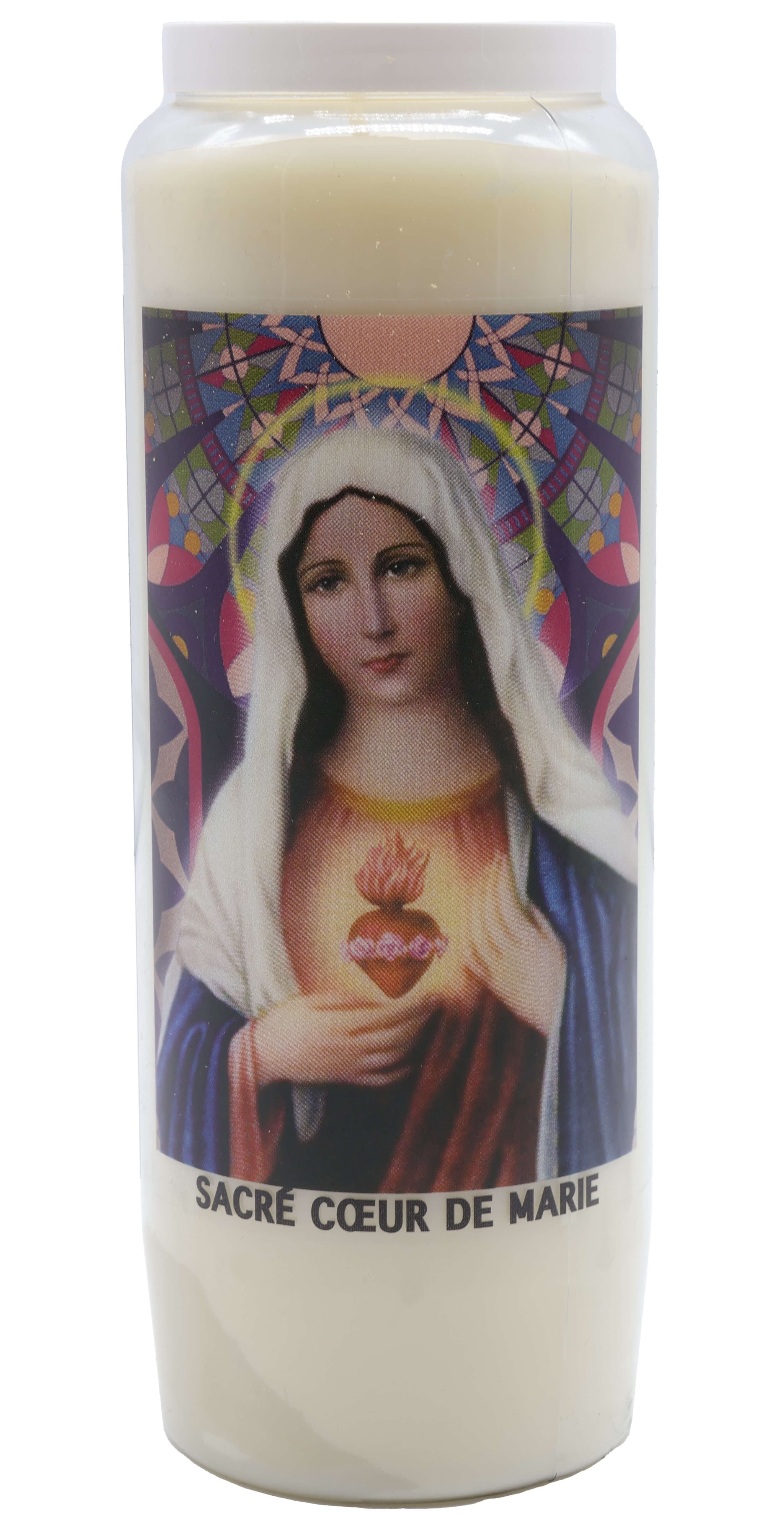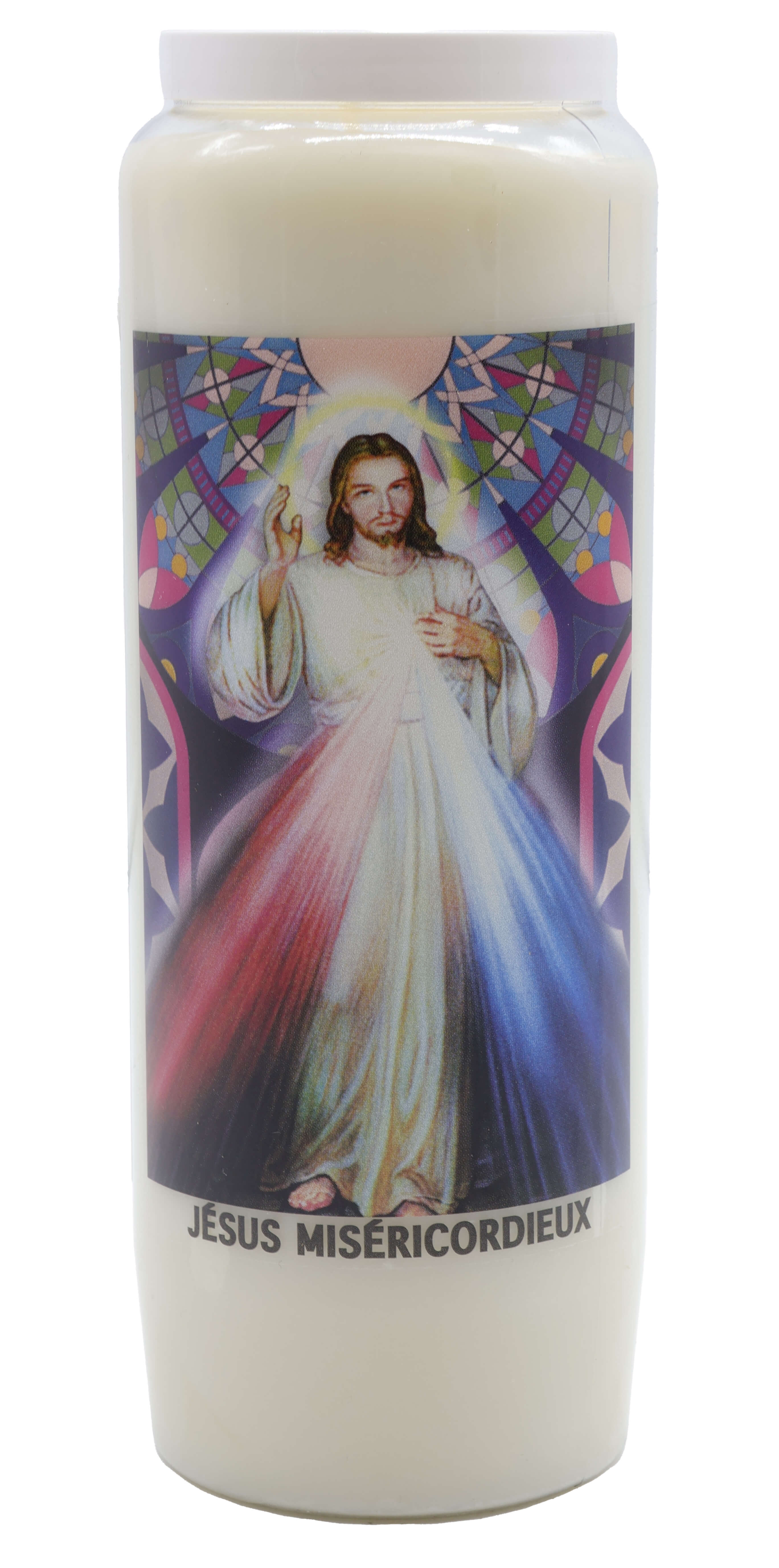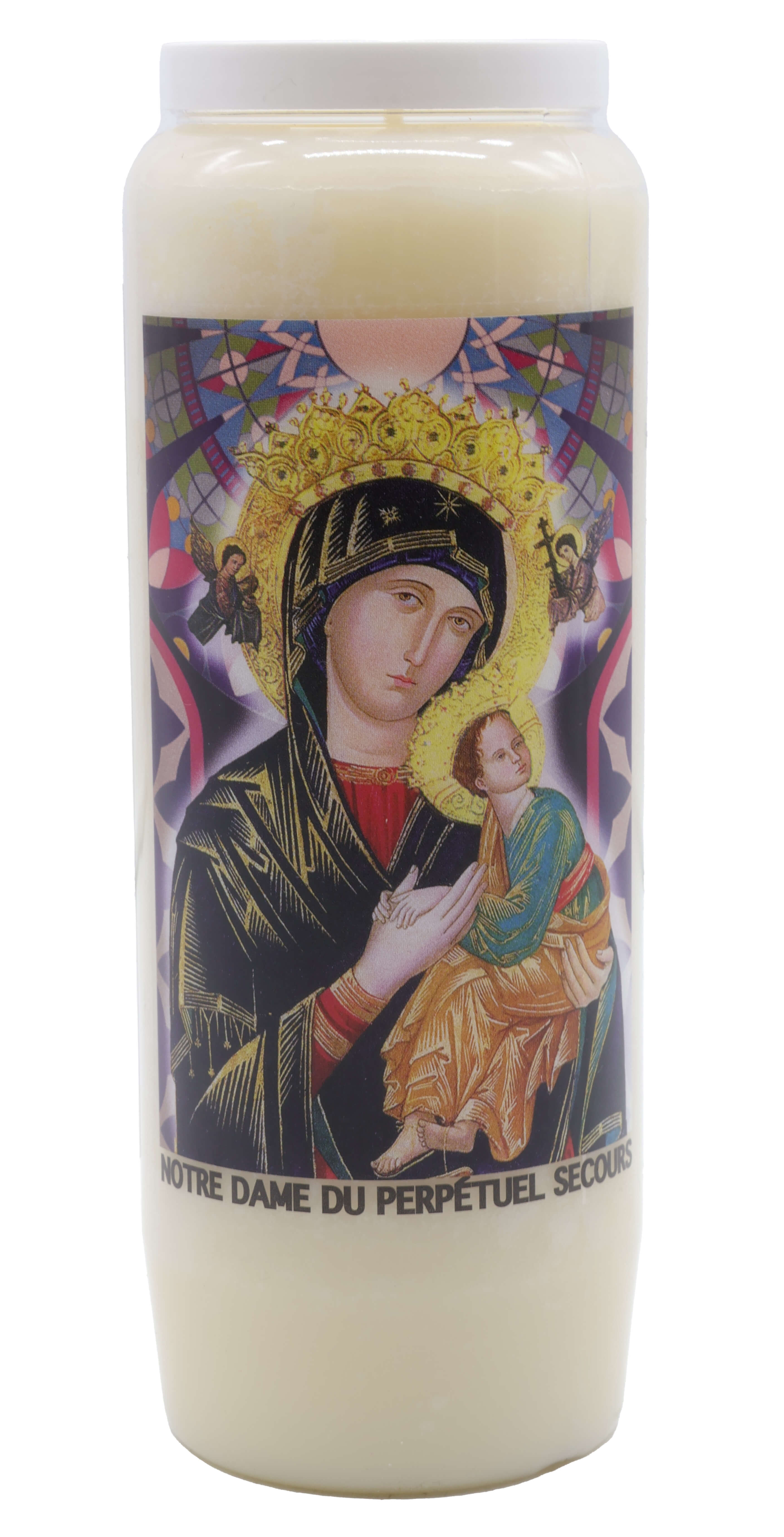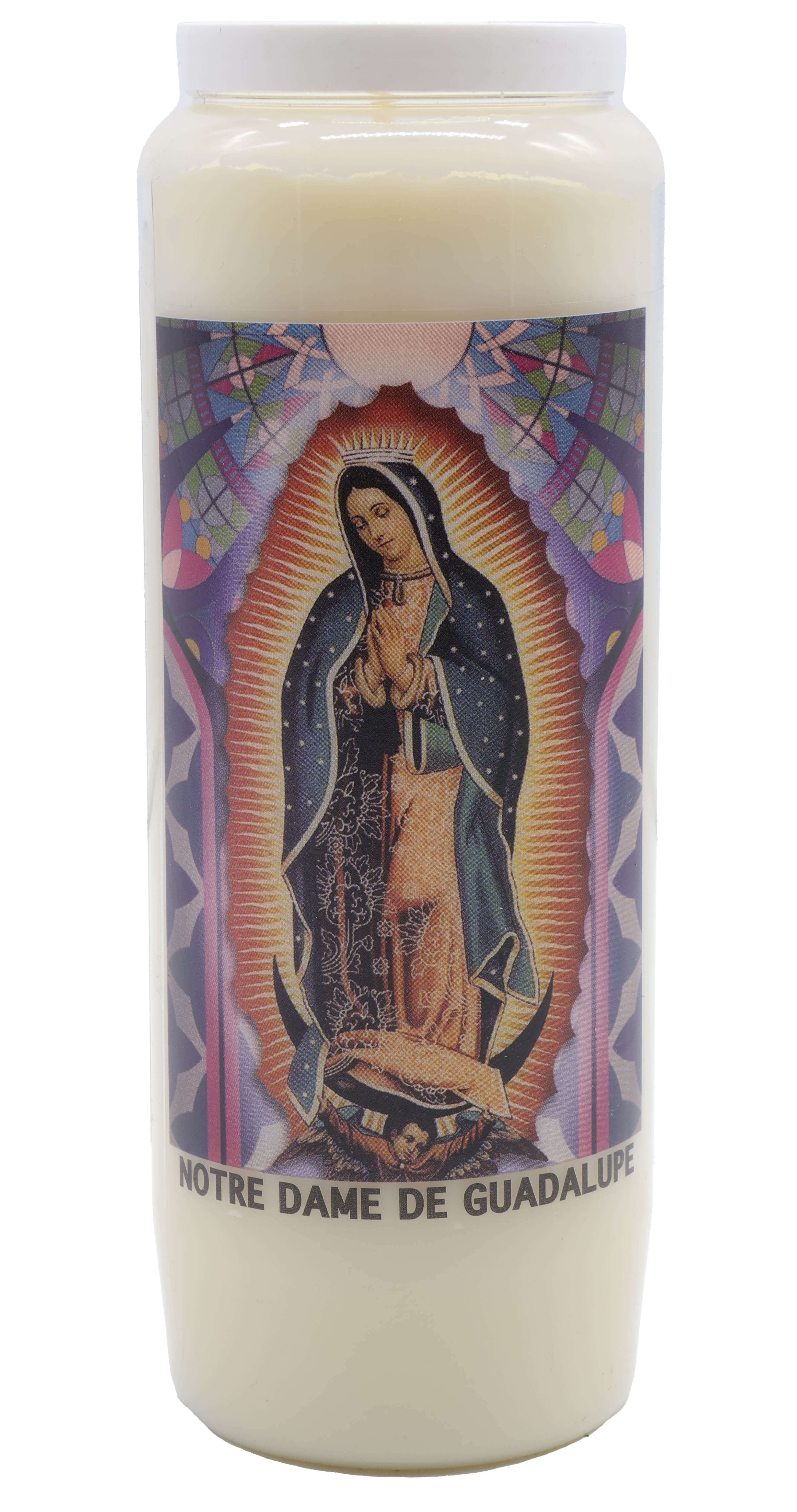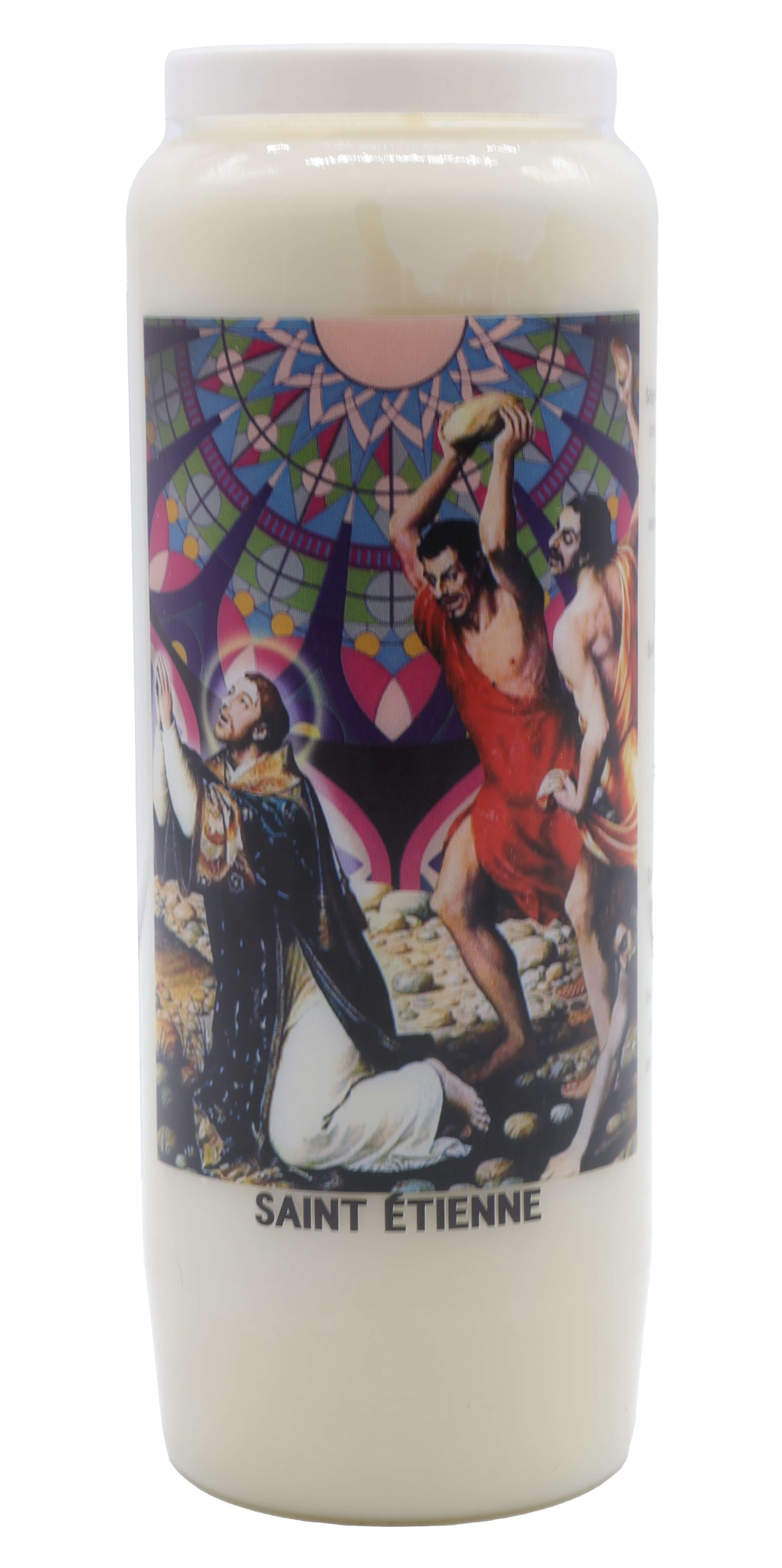 Vendita all'ingrosso di Novene di cera vegetale religiose . Le novene si bruciano per circa 9 giorni. Venduto etichettato in francese con una preghiera sul retro.