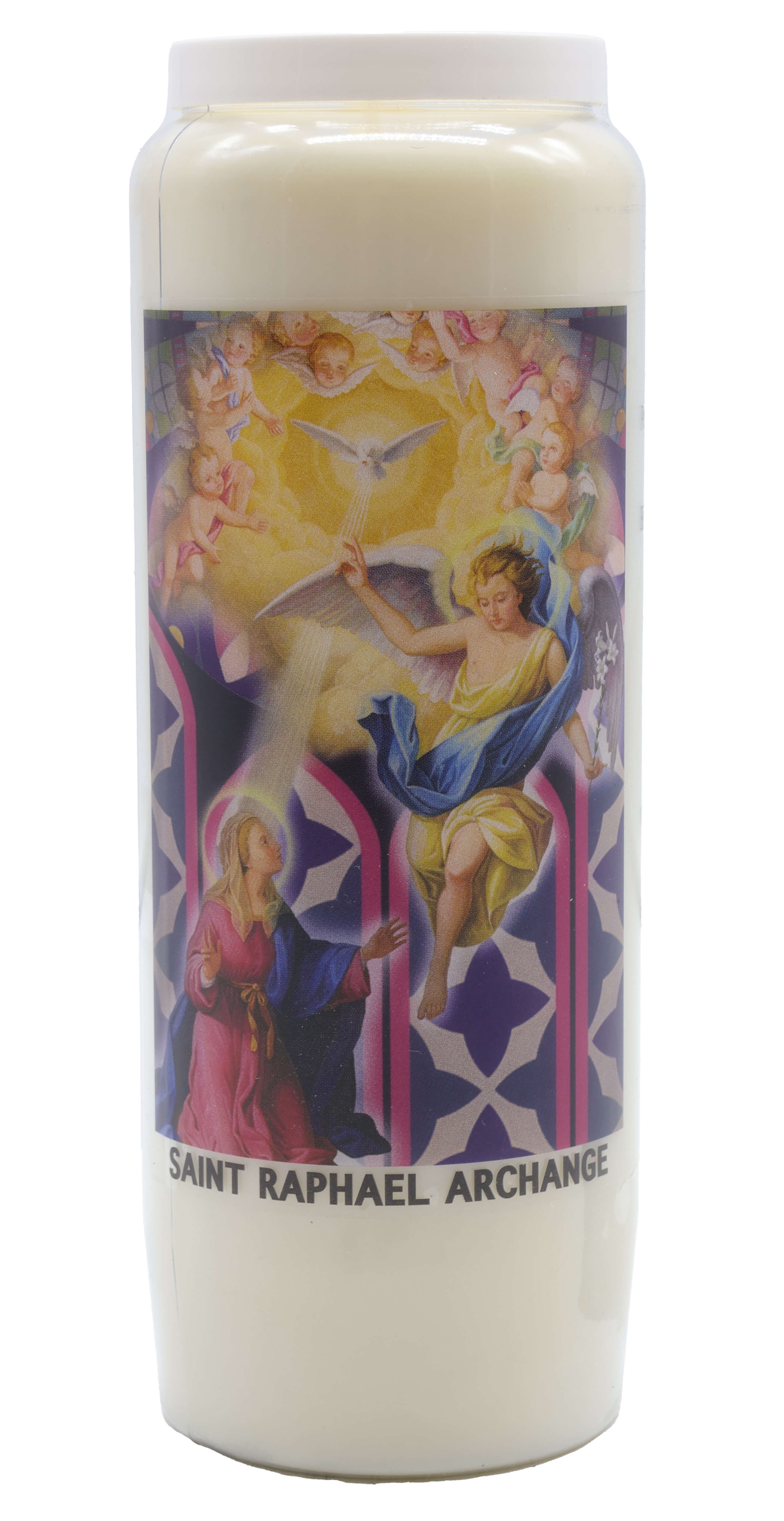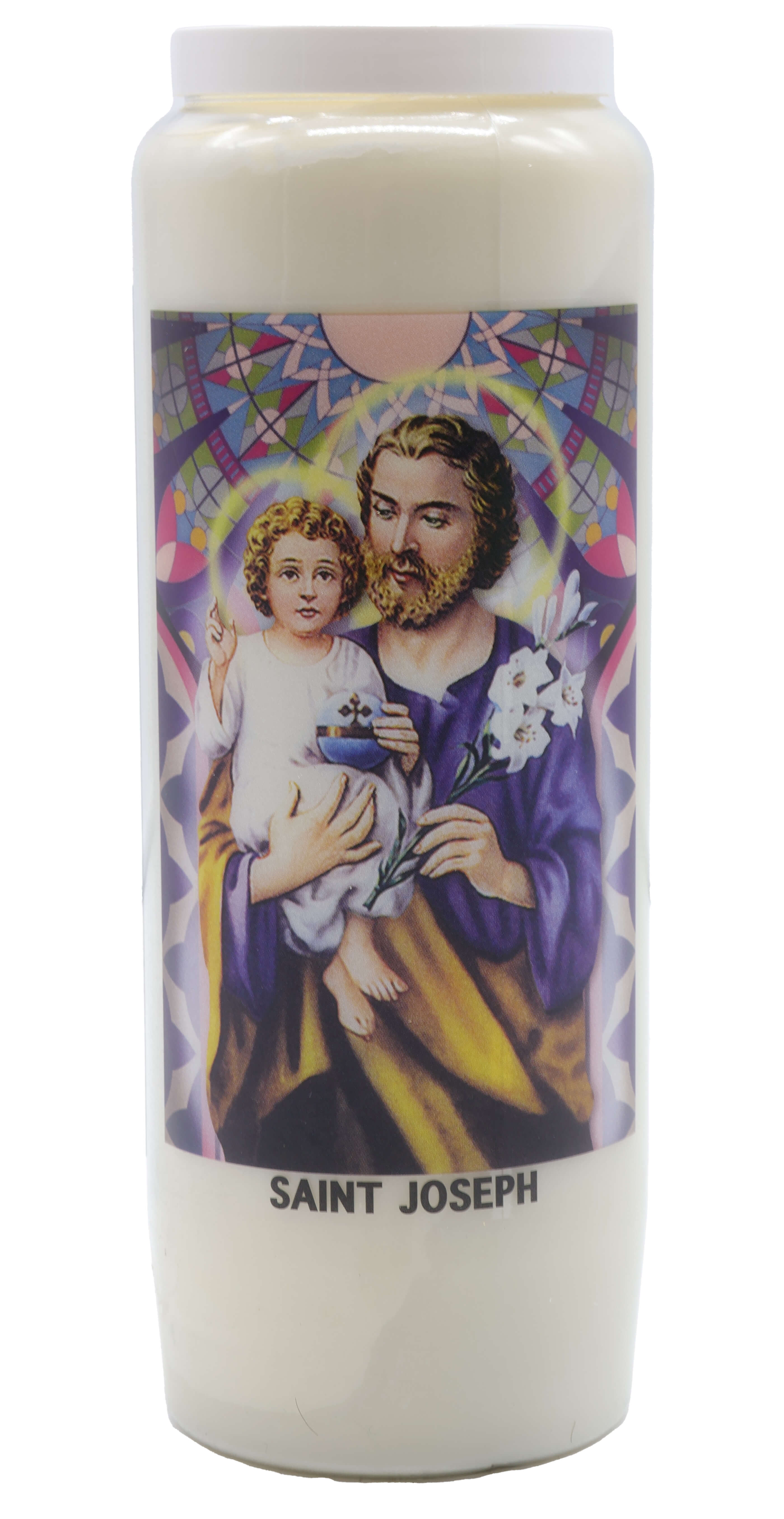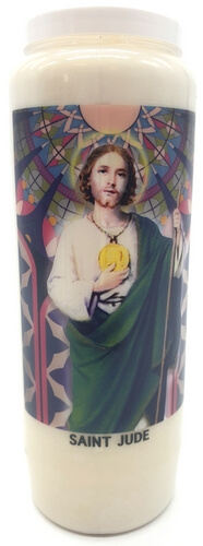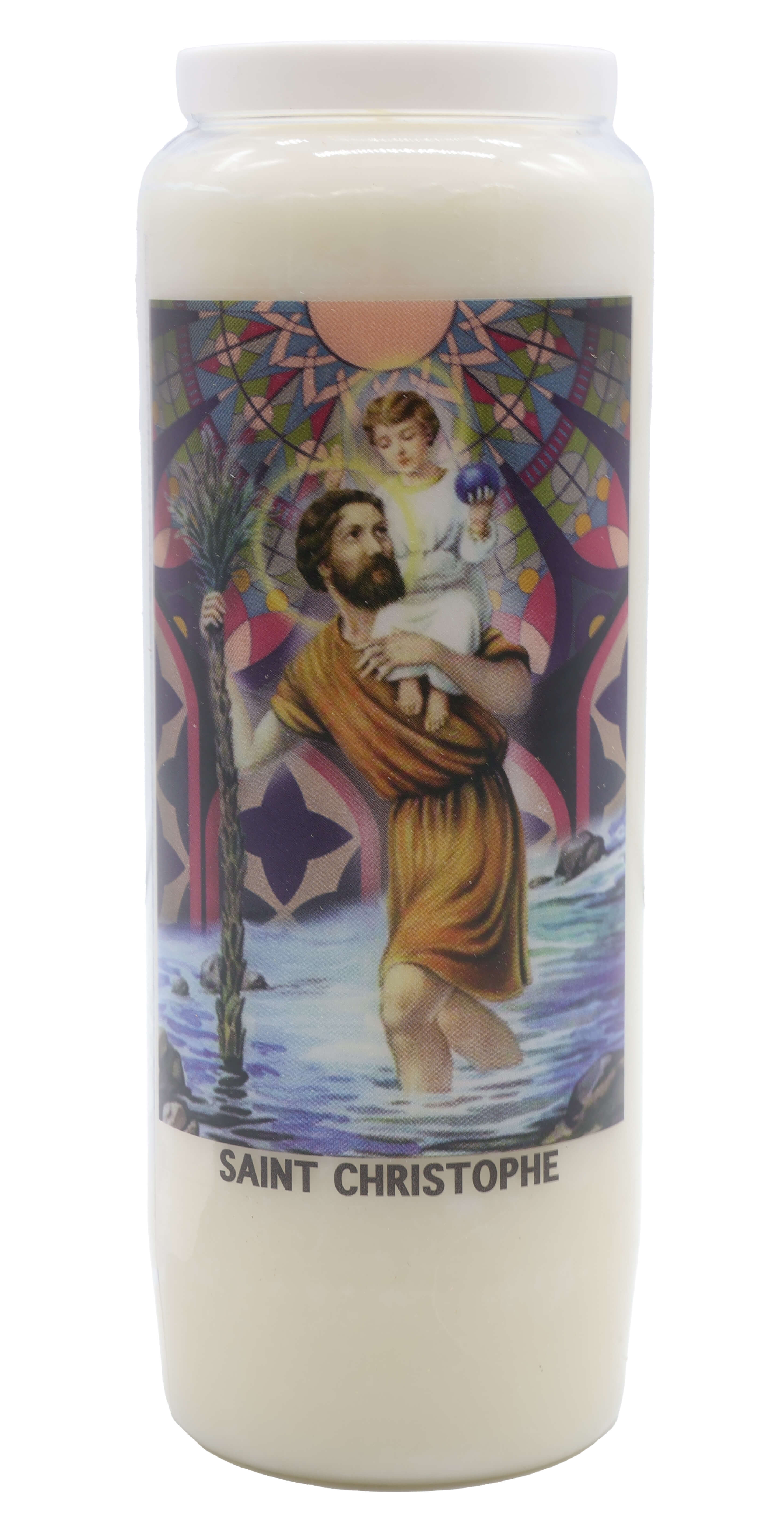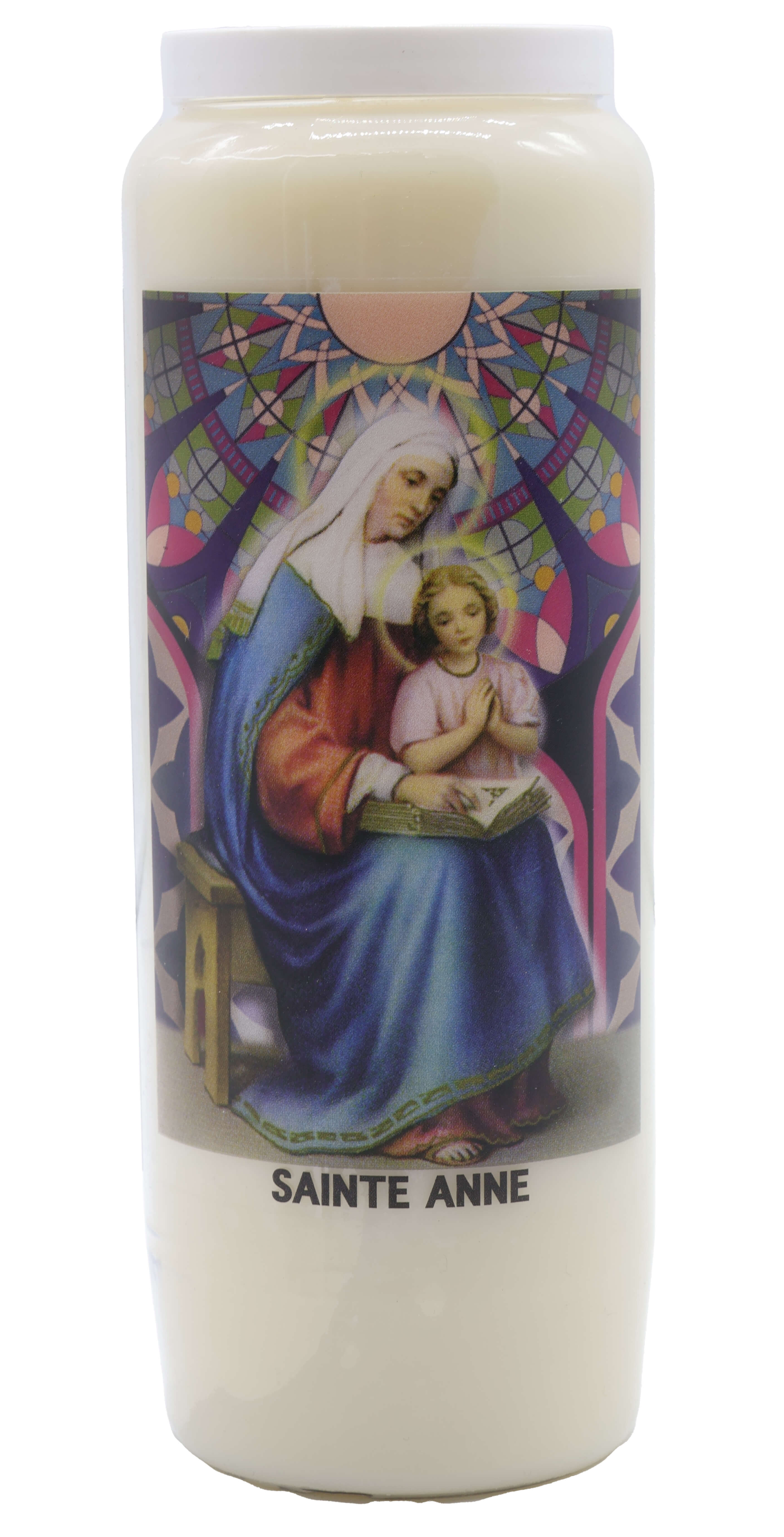 Vendita all'ingrosso di Novene di cera vegetale religiose . Le novene si bruciano per circa 9 giorni. Venduto etichettato in francese con una preghiera sul retro.