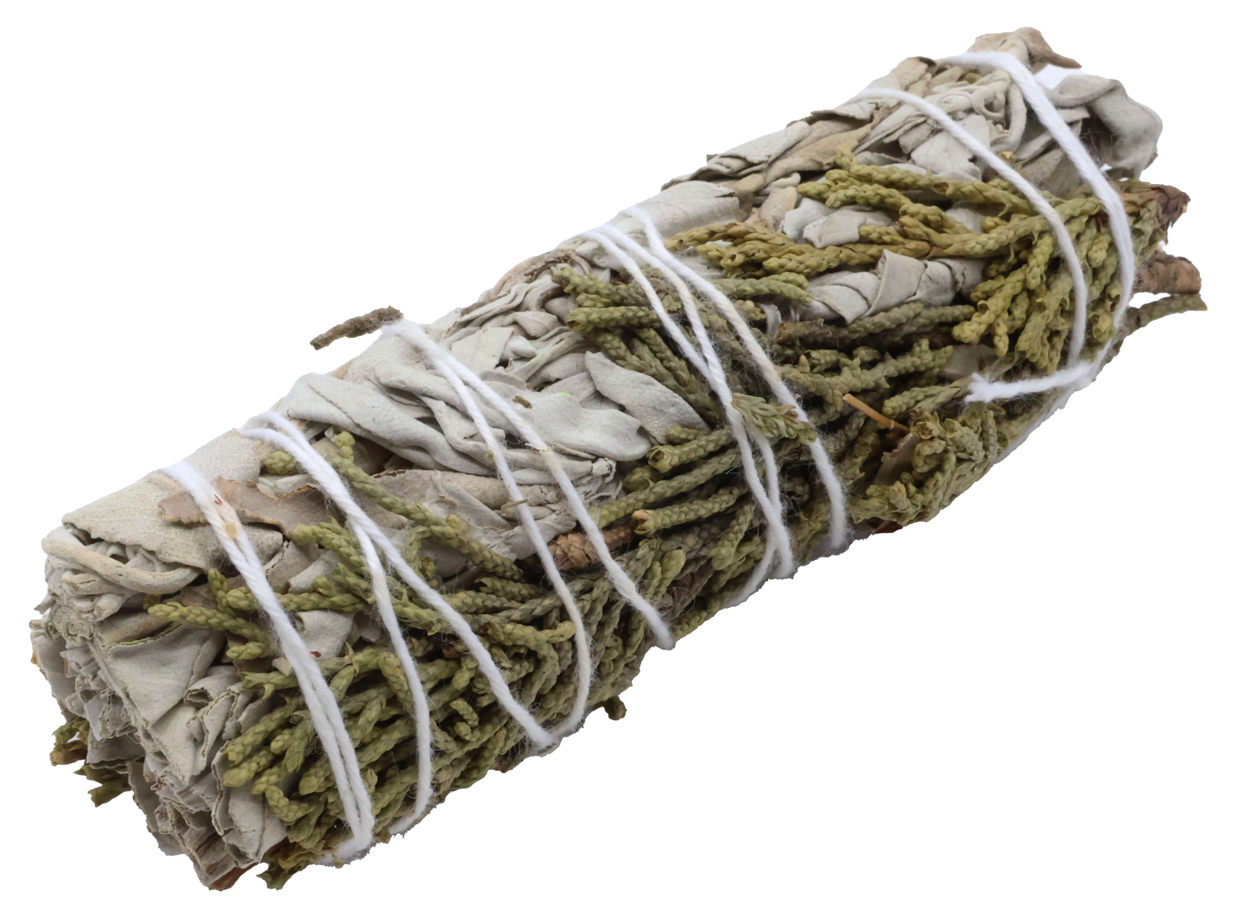 Smudge di salvia bianca mescolata con autentiche foglie di ginepro (ginepro) per un'aromaterapia più completa.
