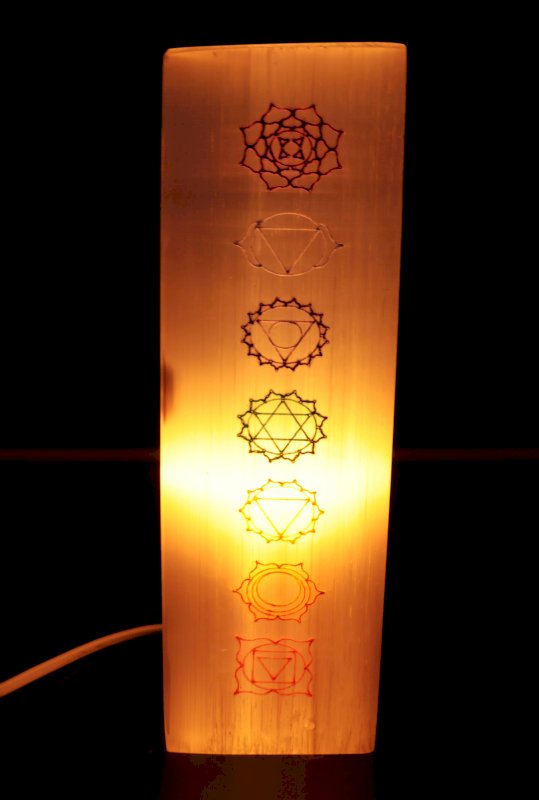 Lampada rettangolare in selenite incisa 25 cm - 7 chakra